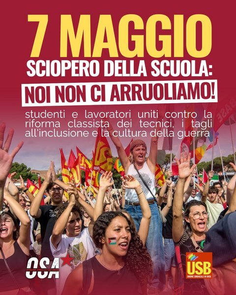 17/04/2026 - USB - 7 maggio Sciopero della Scuola. Contro ogni progetto di leva militare, contro la cultura della guerra. Studenti e lavoratori uniti contro la riforma classista dei tecnici.